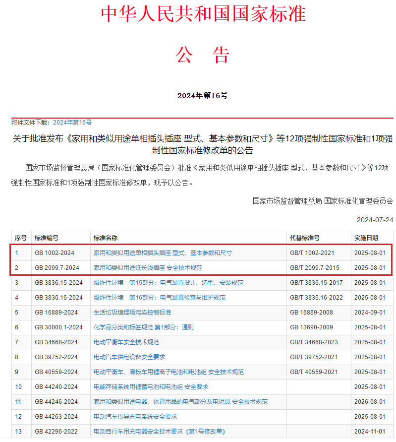 近日,國(guó)家標(biāo)準(zhǔn)GB 1002-2024《家用和類似用途單相插頭插座 型式、基本參數(shù)和尺寸》、GB 2099.7-2024《家用和類似用途延長(zhǎng)線插座 安全技術(shù)規(guī)范》正式發(fā)布,推薦性國(guó)家標(biāo)準(zhǔn)轉(zhuǎn)為強(qiáng)制性國(guó)家標(biāo)準(zhǔn),插頭插座安全強(qiáng)制升級(jí),將于2025年8月1日實(shí)施!